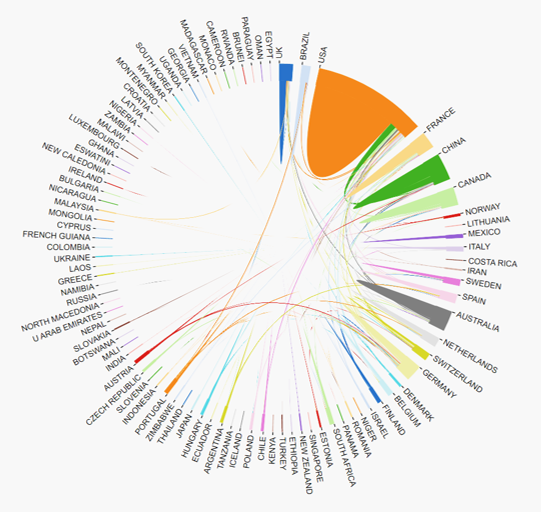 Figure 1 Country cooperation relationship for publications in Landscape Ecology from 1987 to 2022